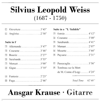 Thus, the elaborated changes to the resonance of the instrument, tasteful use of vibrato and sophisticated techniques of execution, elegant ornamentation and arpeggio passages – all of which suggesting a greater number of strings than there are – help to adapt the music of Silvius Leopold Weiss convincingly so that the effect of the guitar versions is clearly natural and authentic.